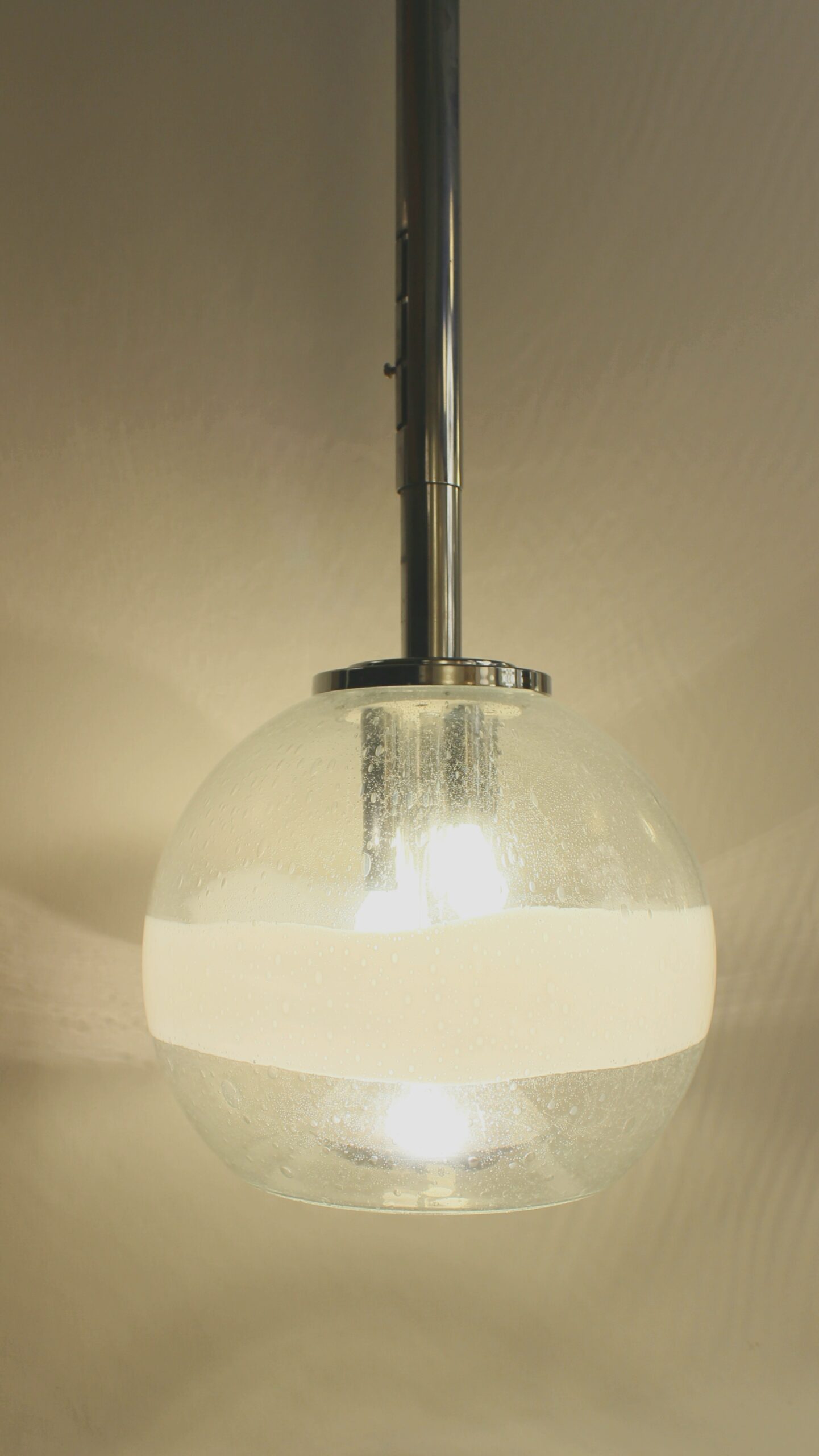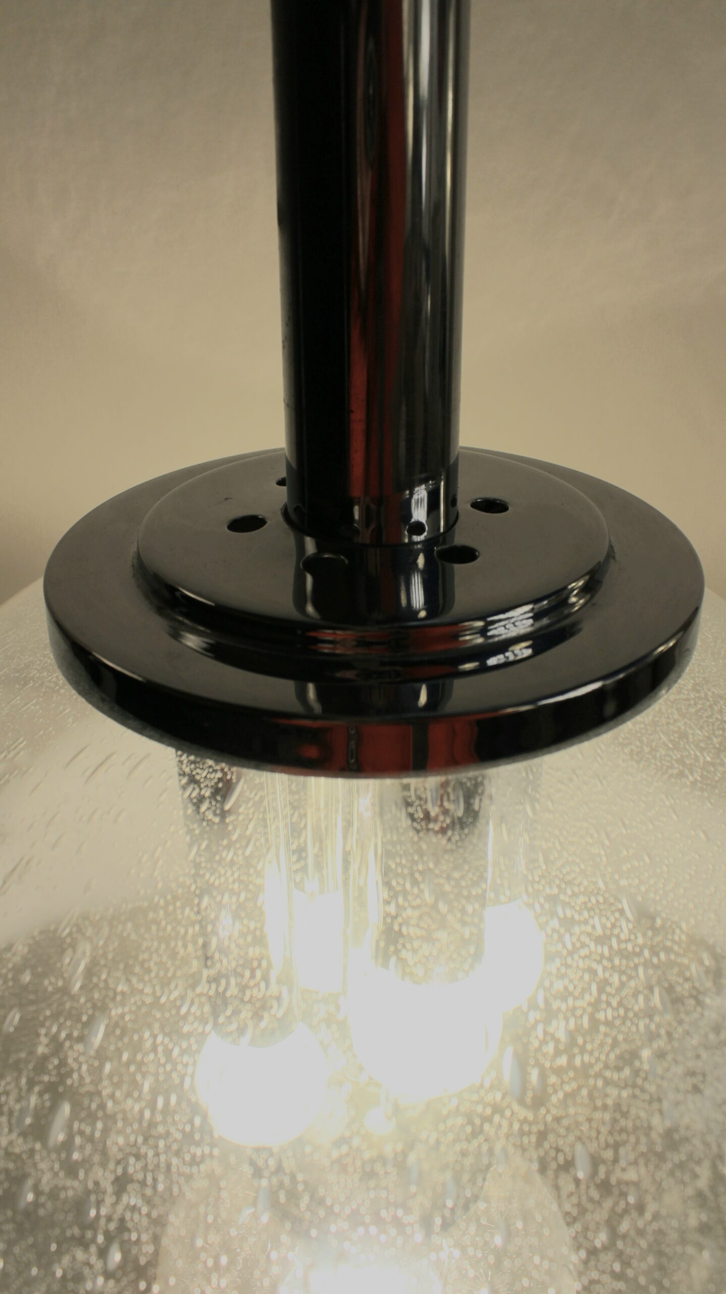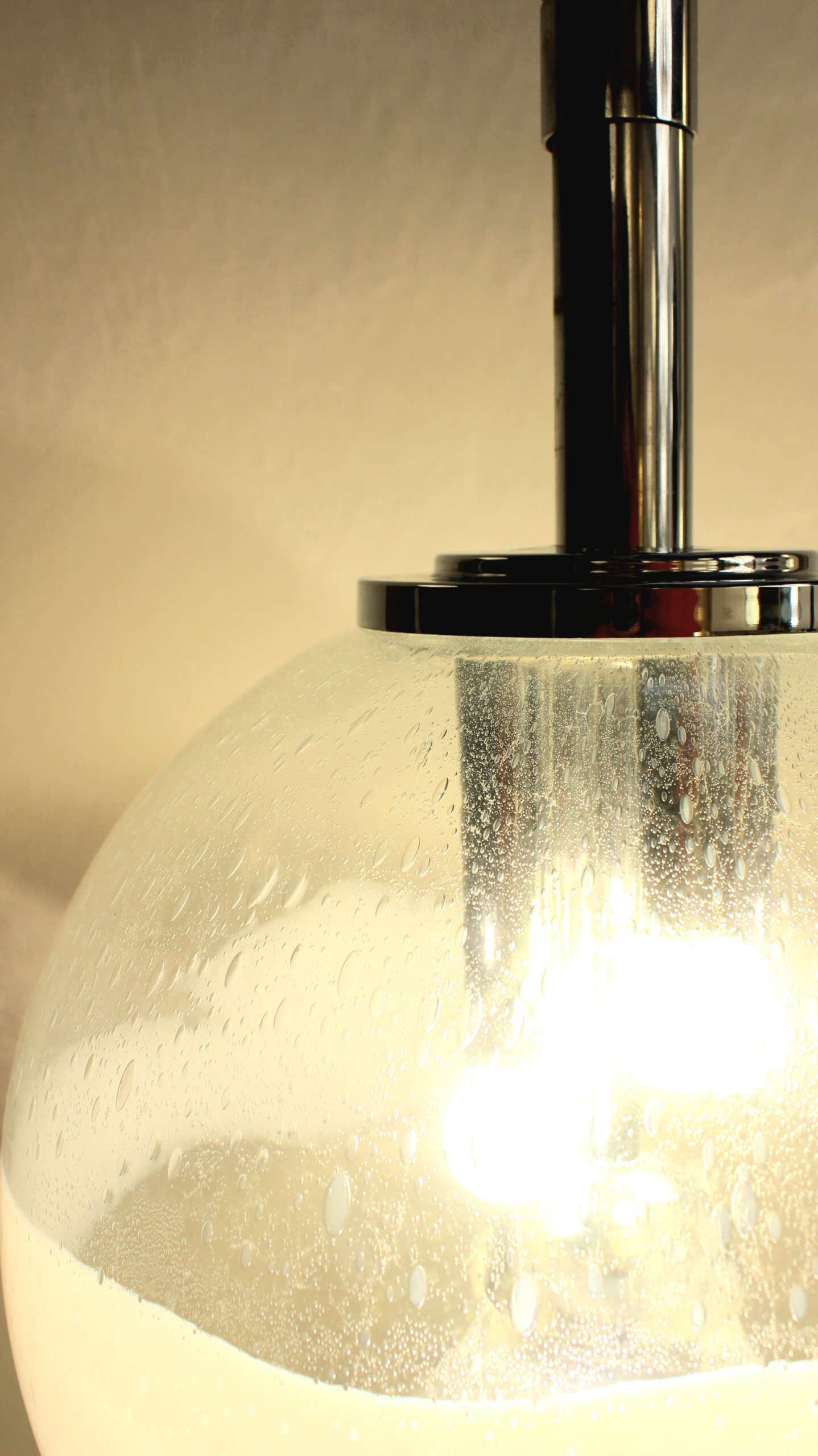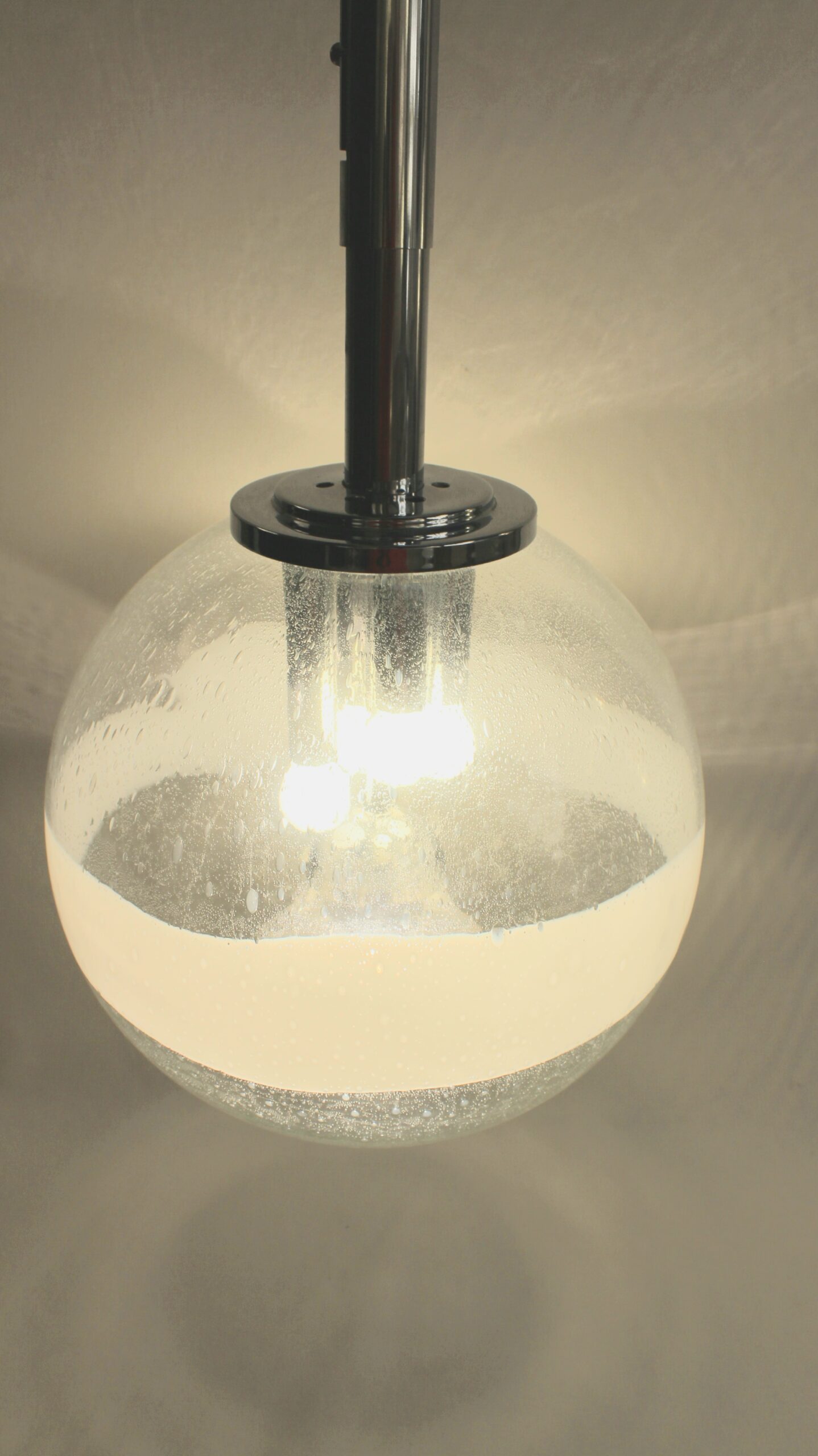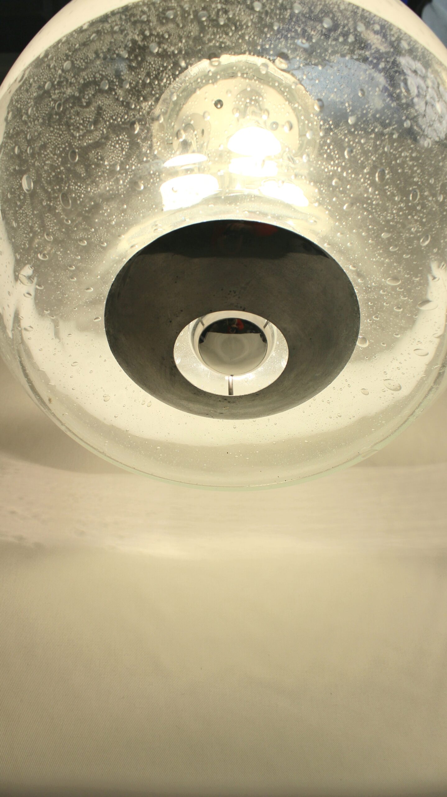 Globe de grande taille en verre de Murano soufflé et utilisant la technique de « Pulegoso », en mélangeant le verre en fusion et du bicarbonate de soude, Ce dernier se décompose avec la chaleur créant des bulles d’air dans la matière.