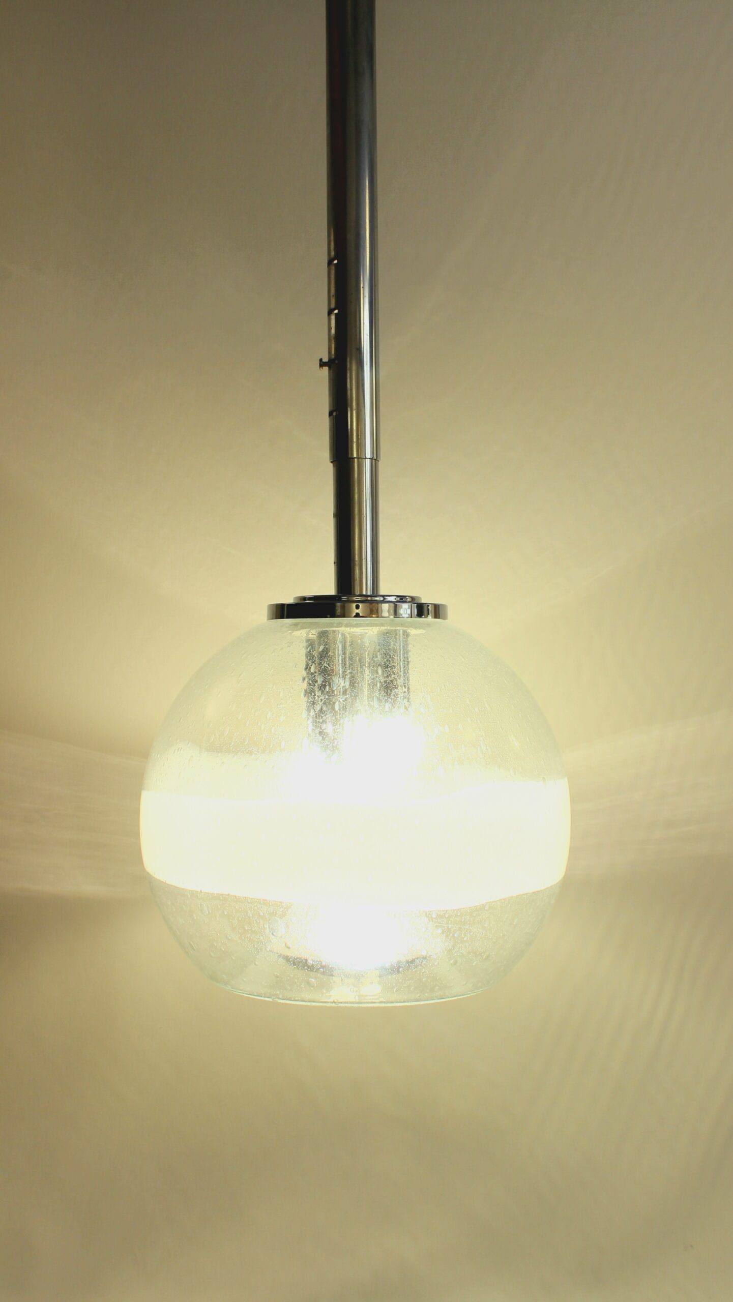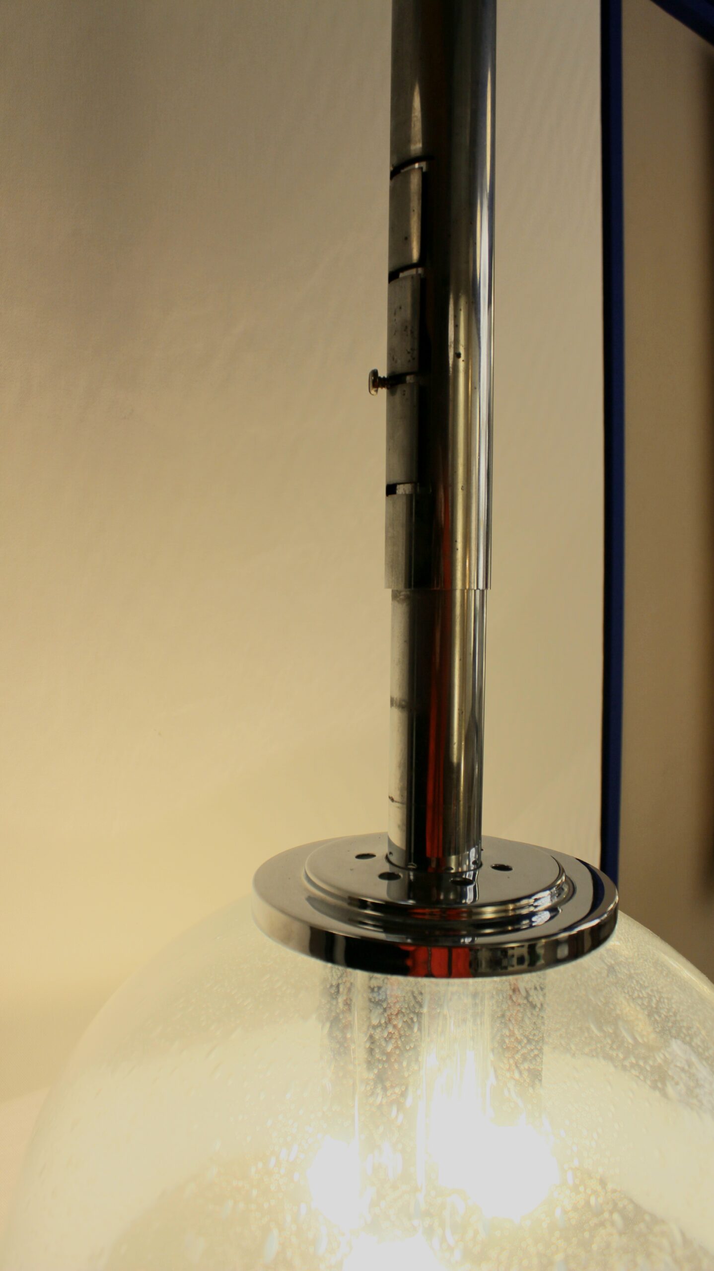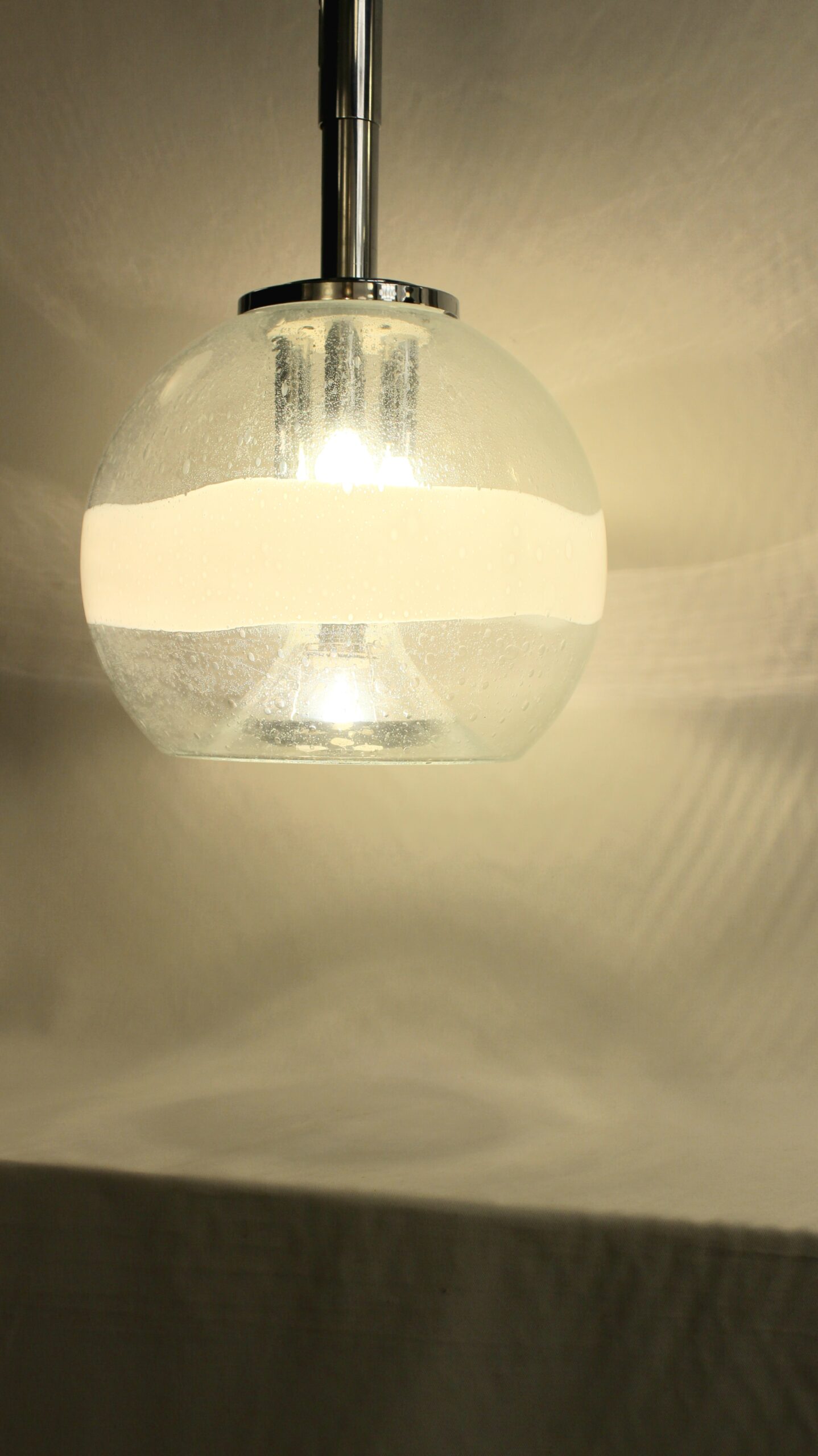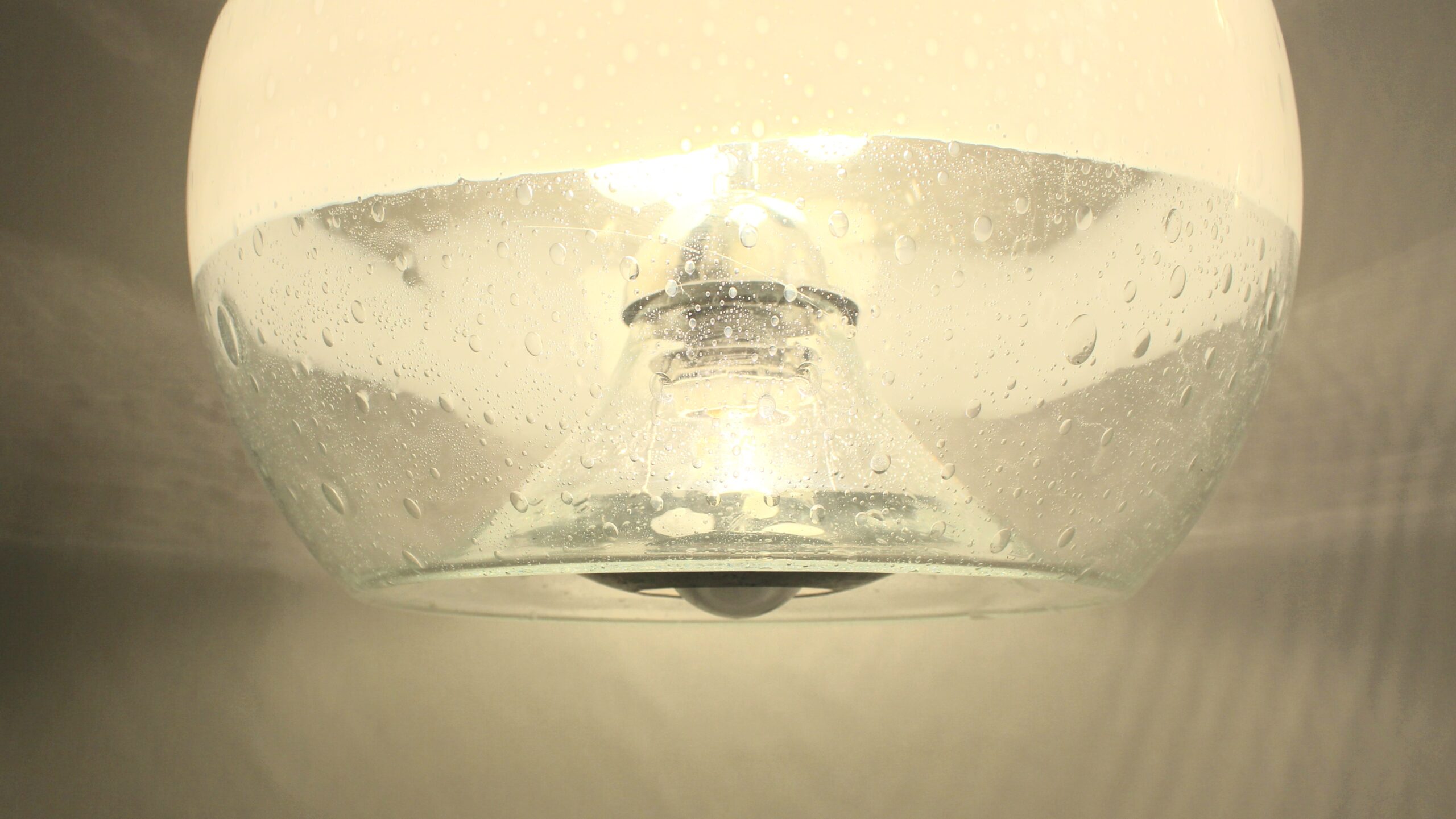 Globe de grande taille en verre de Murano soufflé et utilisant la technique de « Pulegoso », en mélangeant le verre en fusion et du bicarbonate de soude, Ce dernier se décompose avec la chaleur créant des bulles d’air dans la matière.