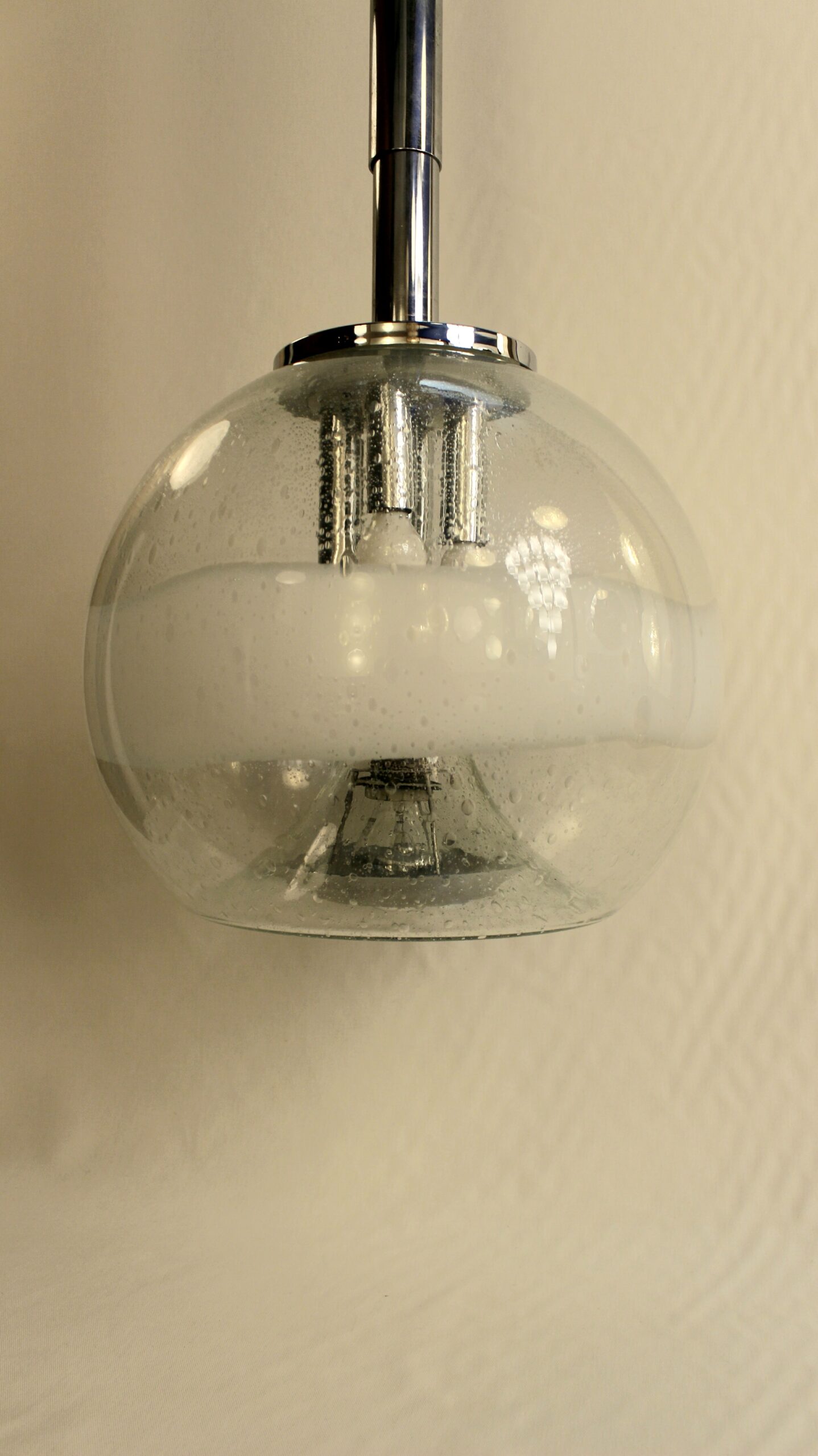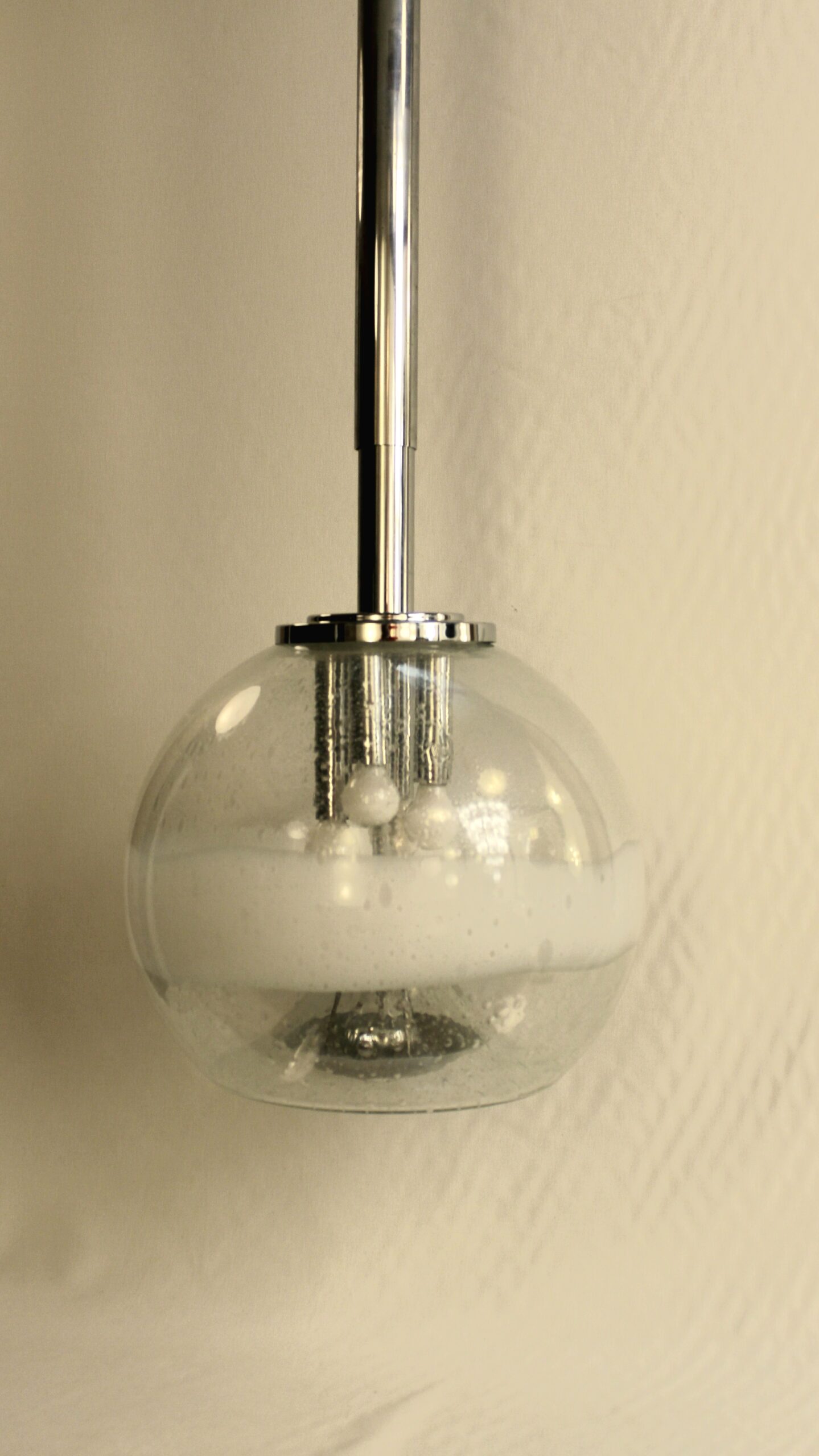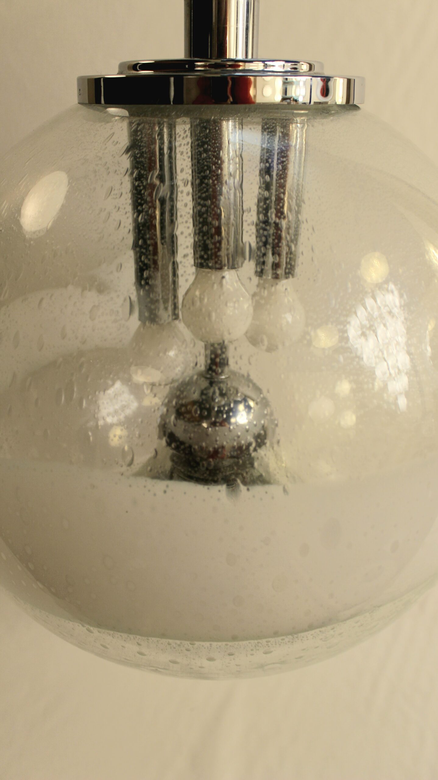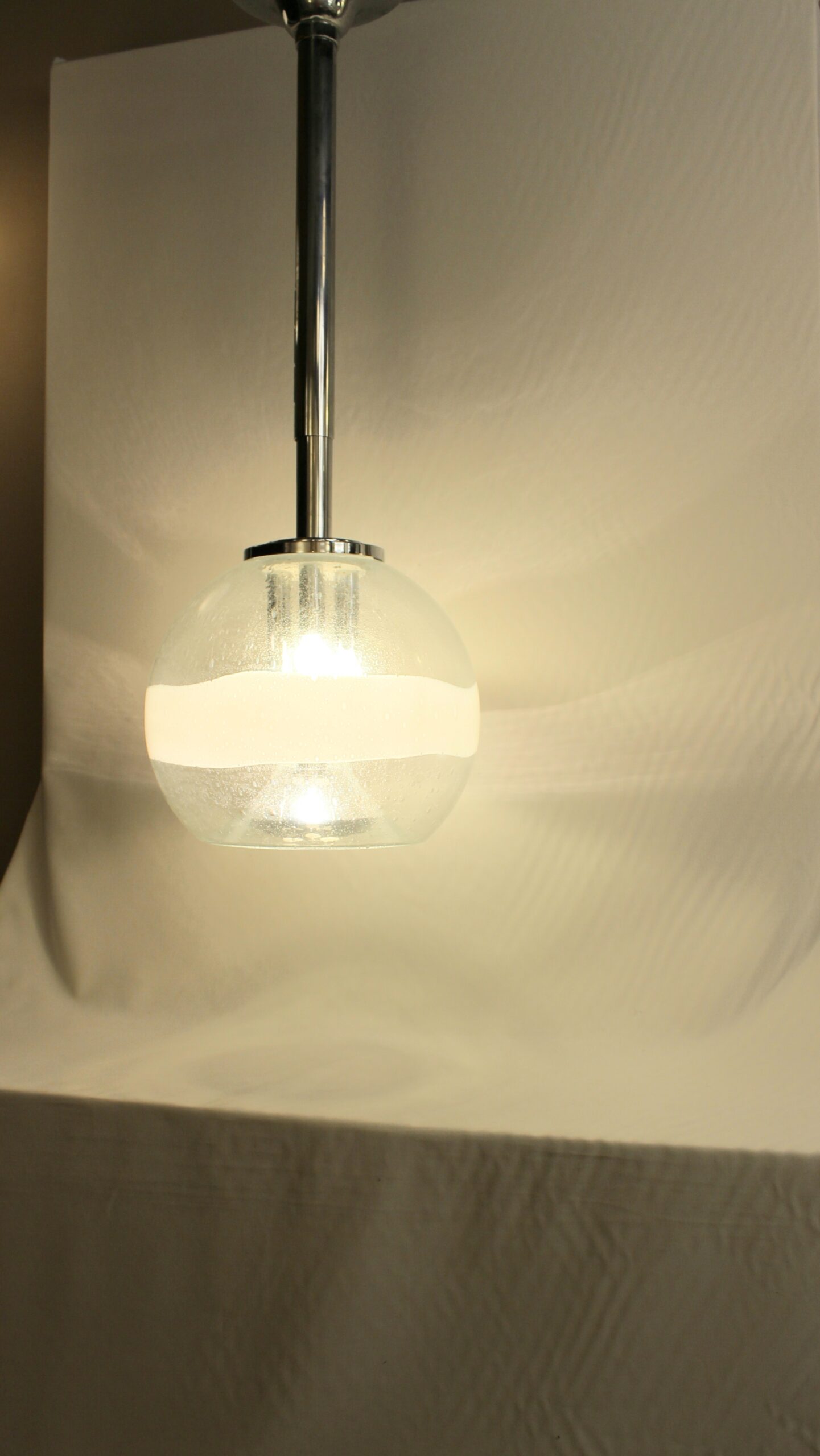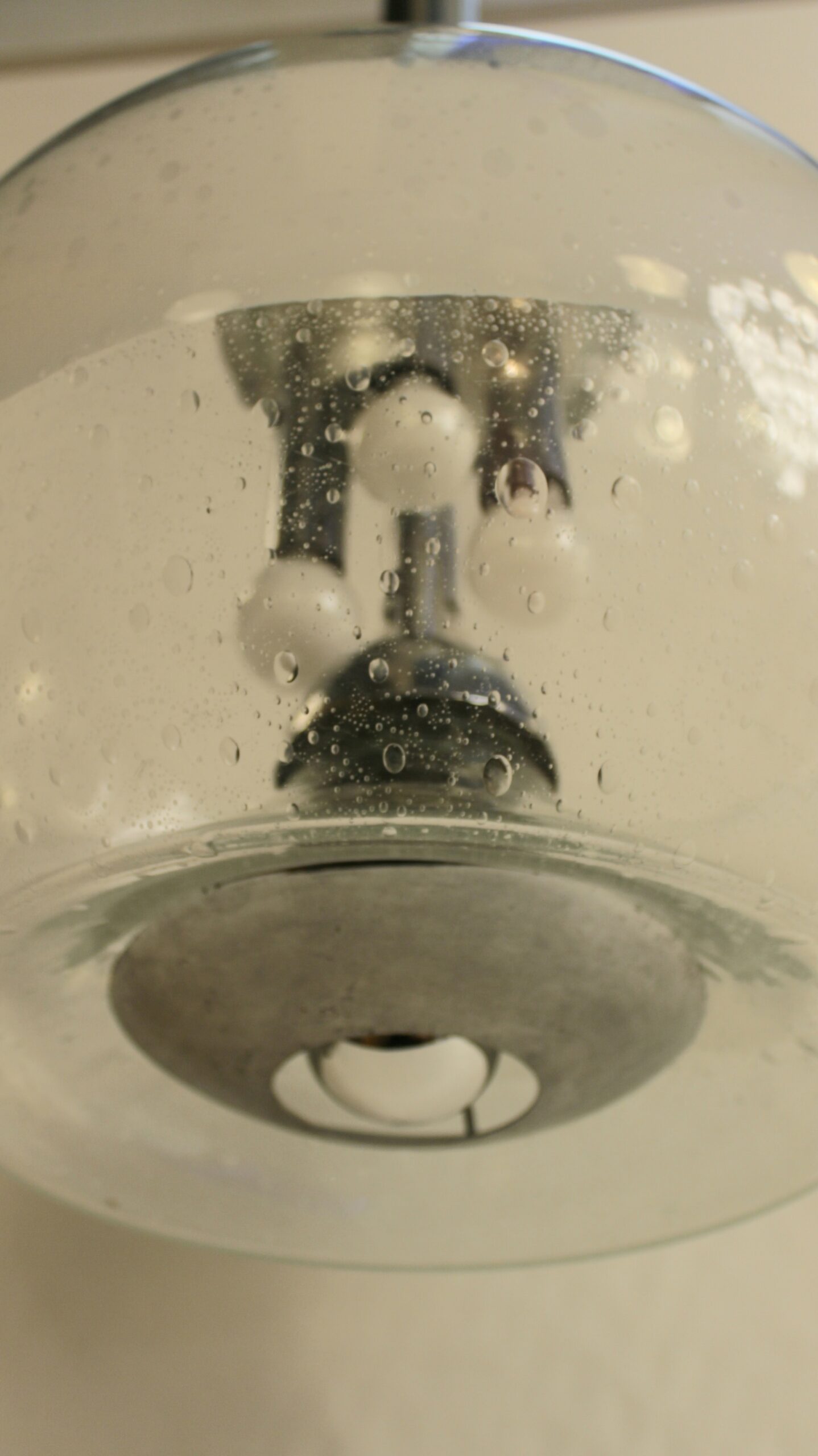 Globe de grande taille en verre de Murano soufflé et utilisant la technique de « Pulegoso », en mélangeant le verre en fusion et du bicarbonate de soude, Ce dernier se décompose avec la chaleur créant des bulles d’air dans la matière.