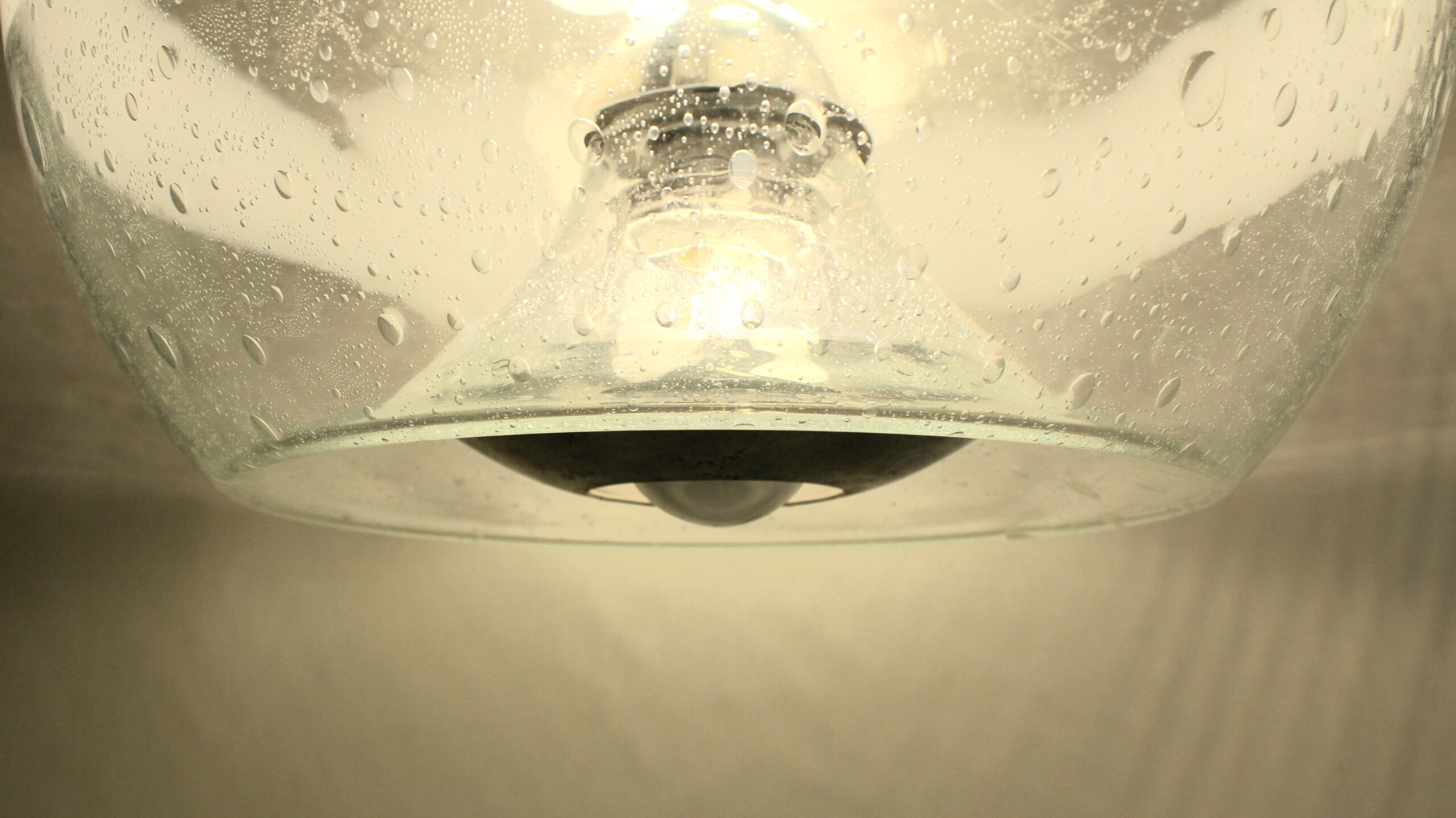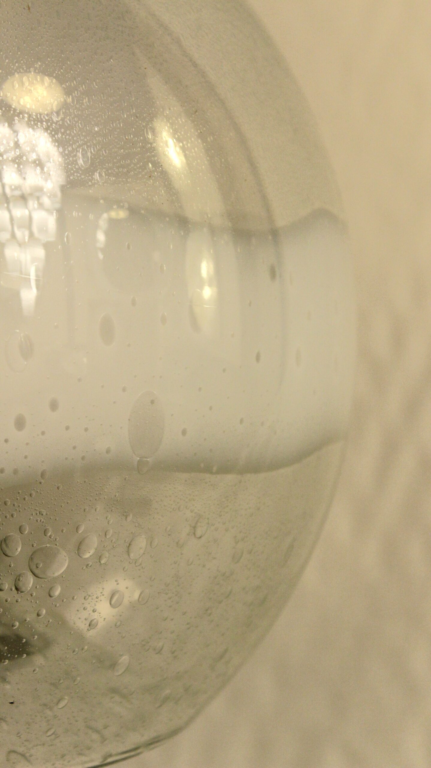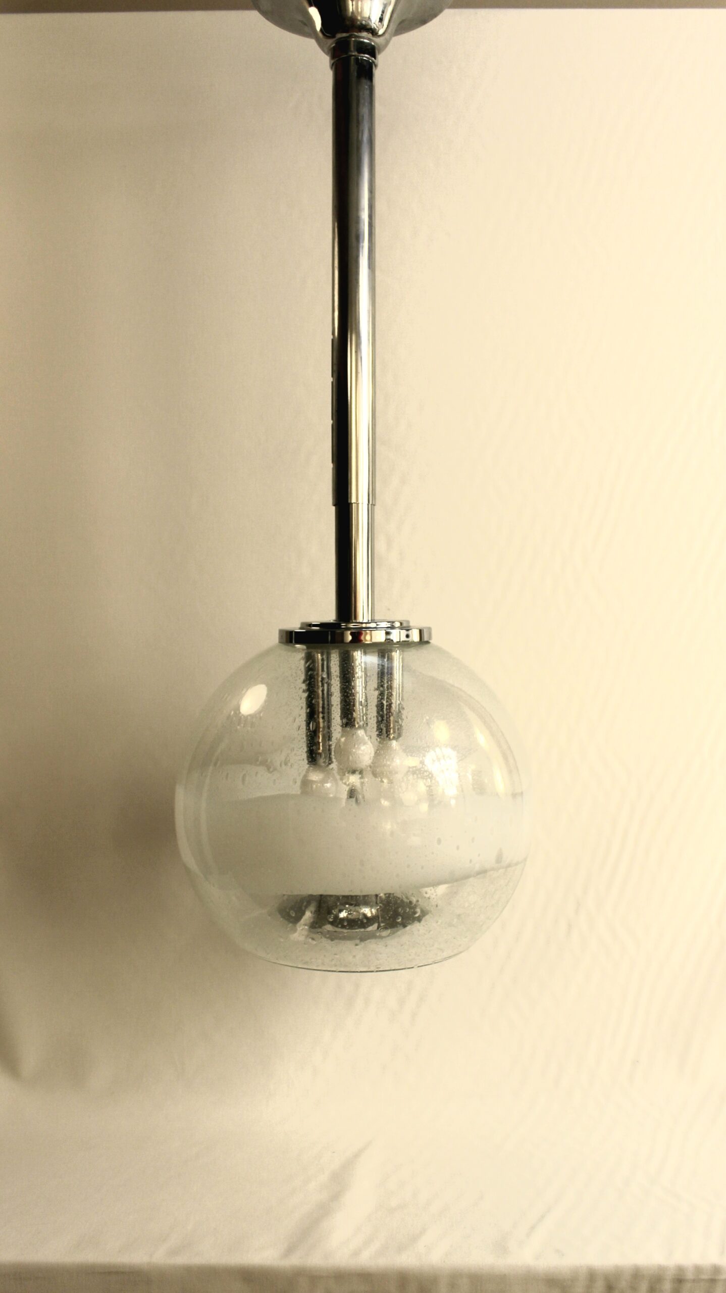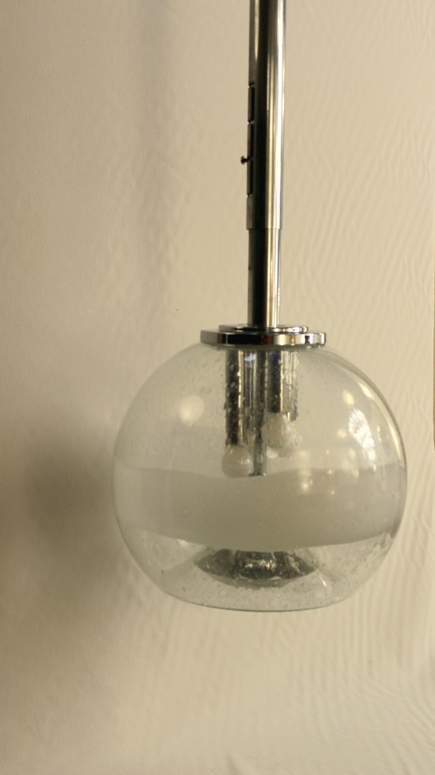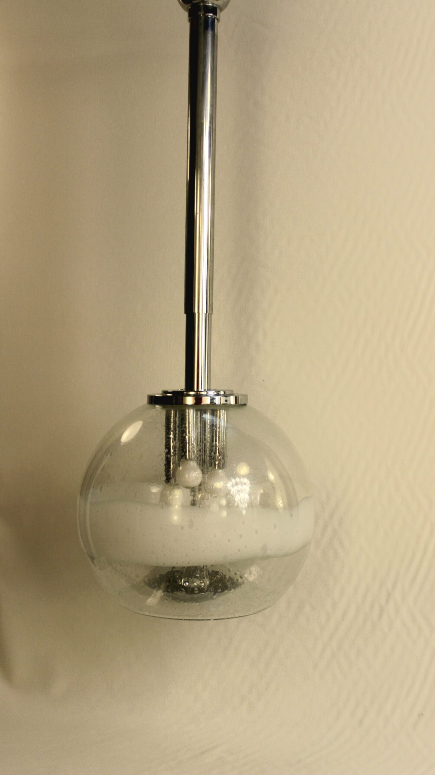 Globe de grande taille en verre de Murano soufflé et utilisant la technique de « Pulegoso », en mélangeant le verre en fusion et du bicarbonate de soude, Ce dernier se décompose avec la chaleur créant des bulles d’air dans la matière.