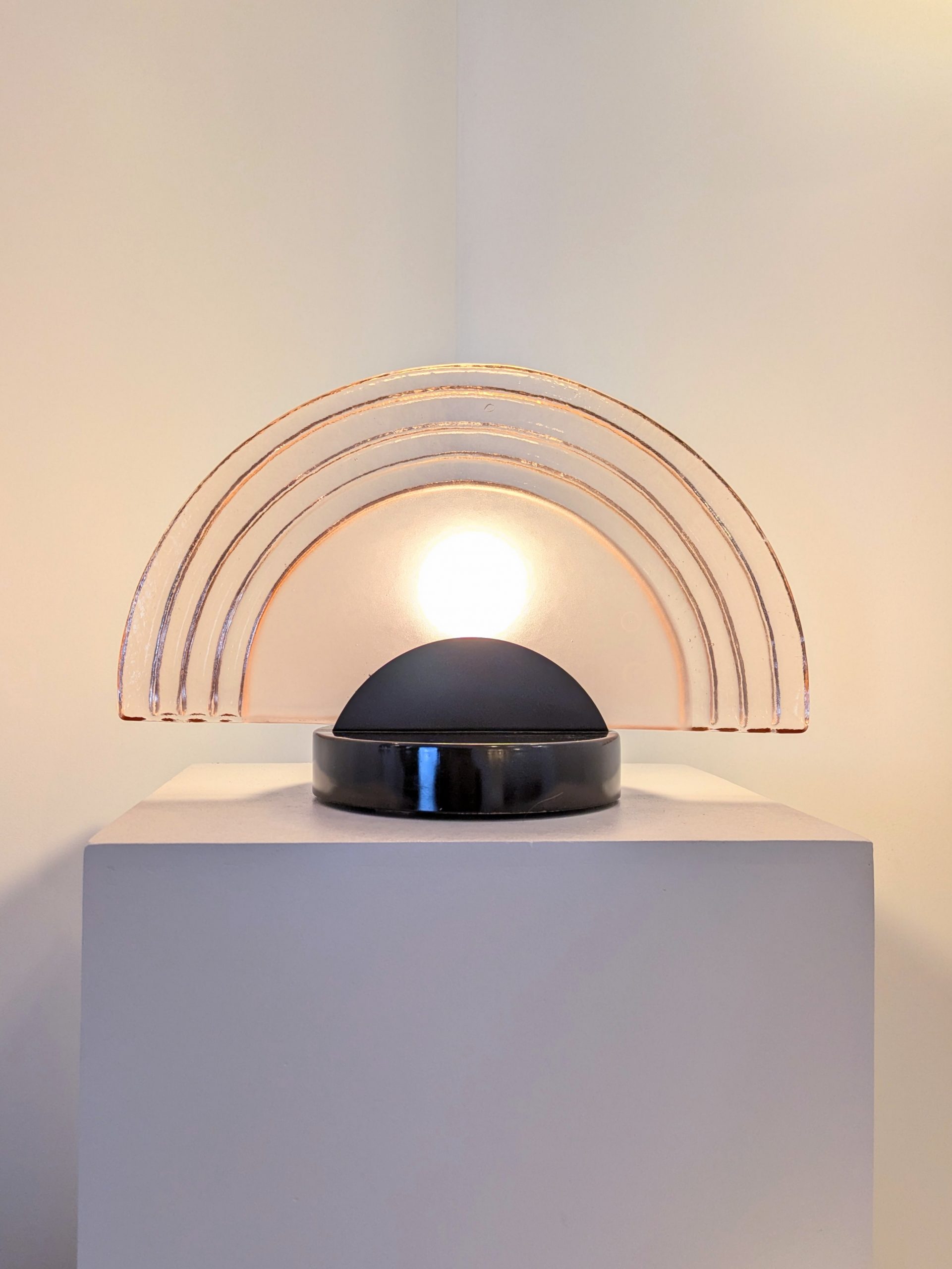 Pair of two table lamps model Diva made by Artemide and designed by Ezio Didone in the 1980’s.It appears that the glass would be just a part od the original lighting and the base has been produced to turn the original sconce into table lamp. The pink color in blown glass and art glass is the most expensive to make as they use gold and silver in the mixture to get this color tint.