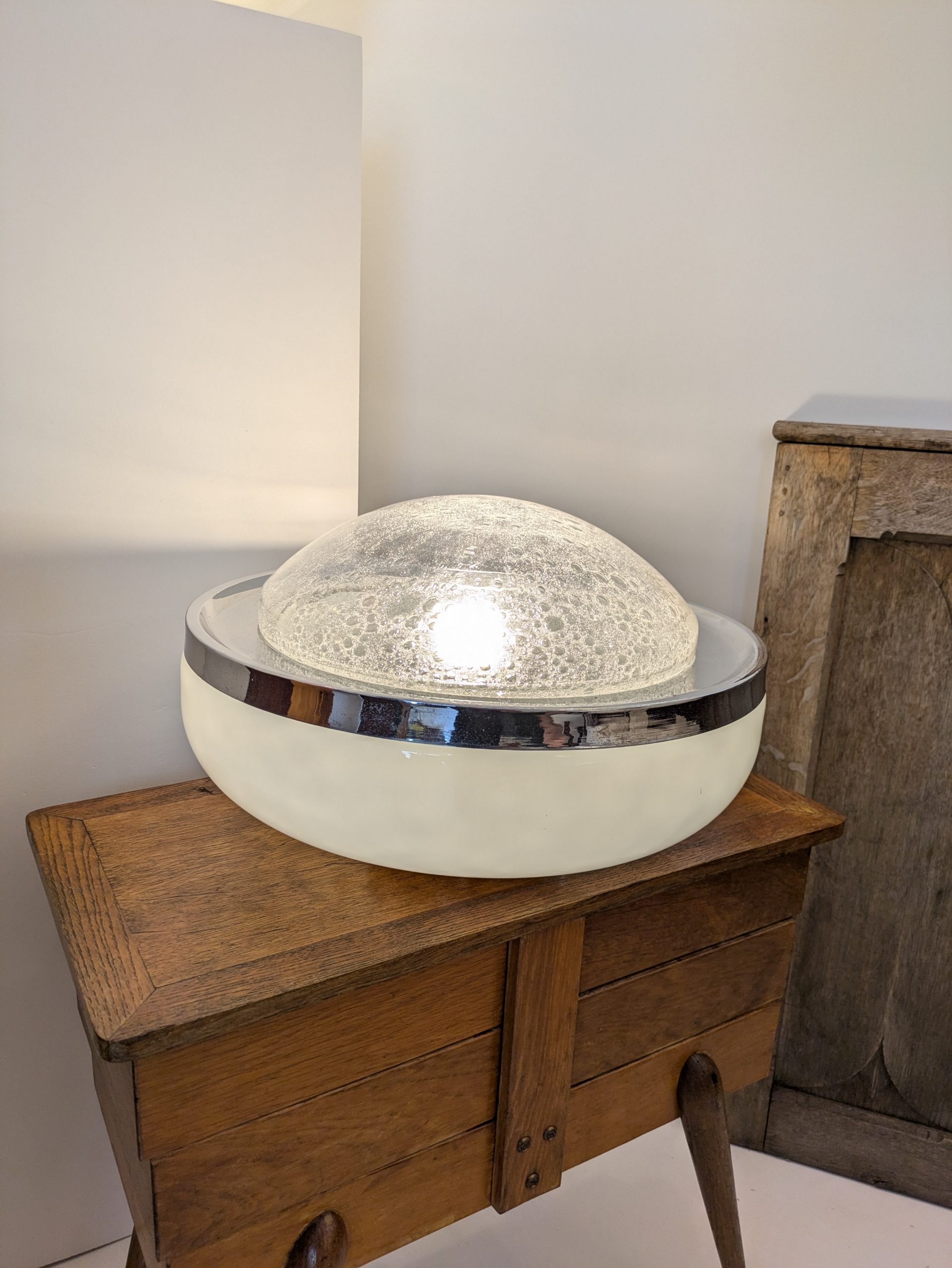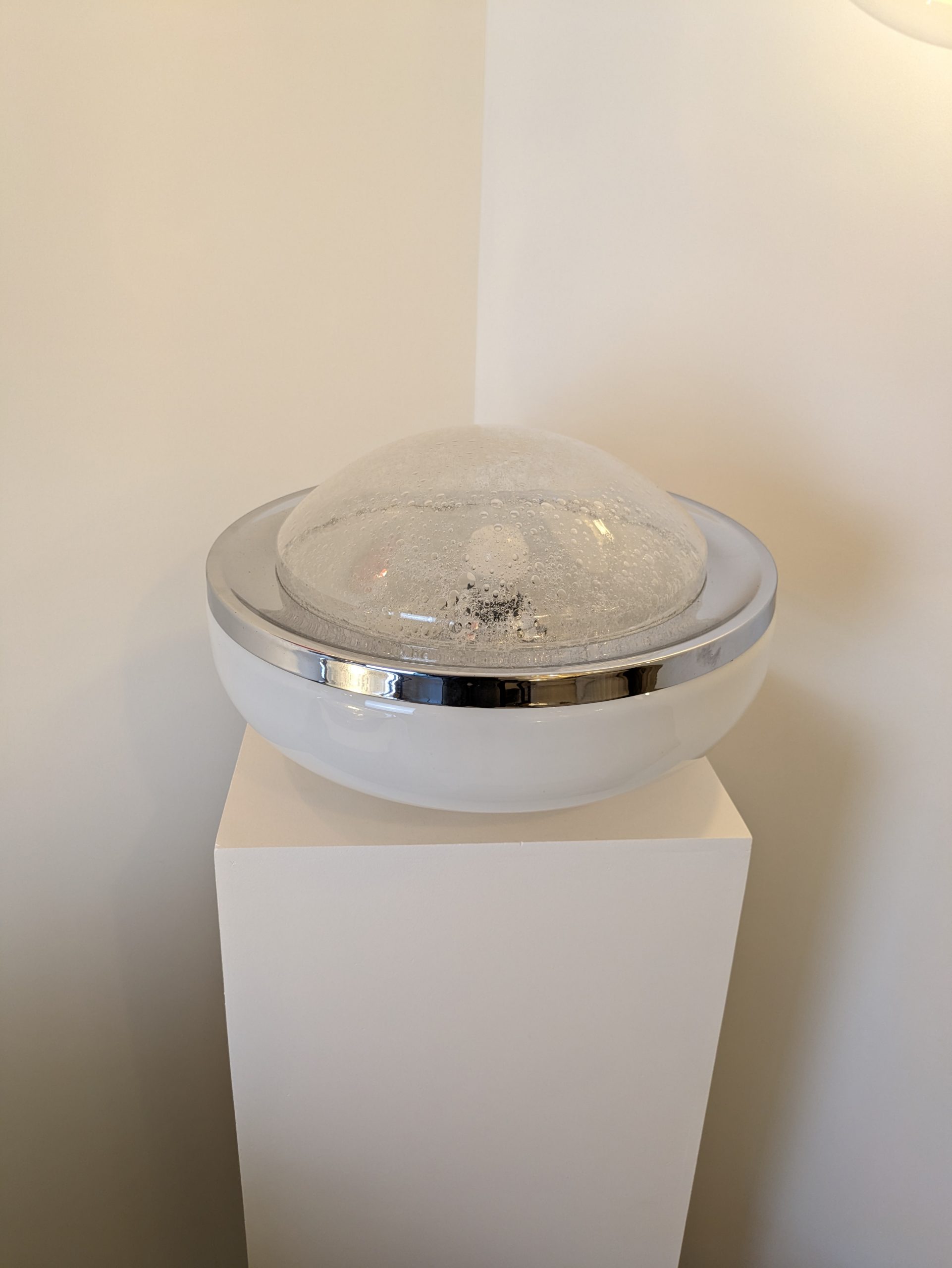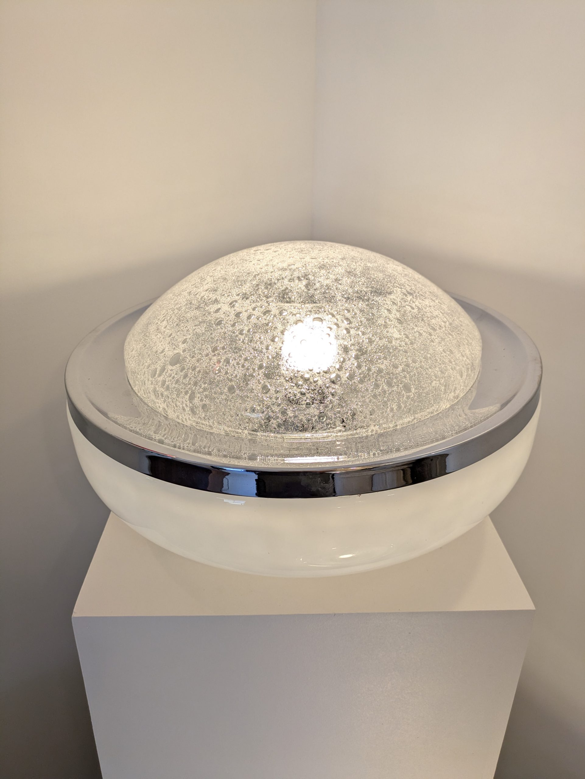 The center piece is in clear glass and has bubbles on the inside, we call it « pulegosso » technique. When the glass is melted, they add bicarbonate of sodium that release gas when brought to a certain temperature.