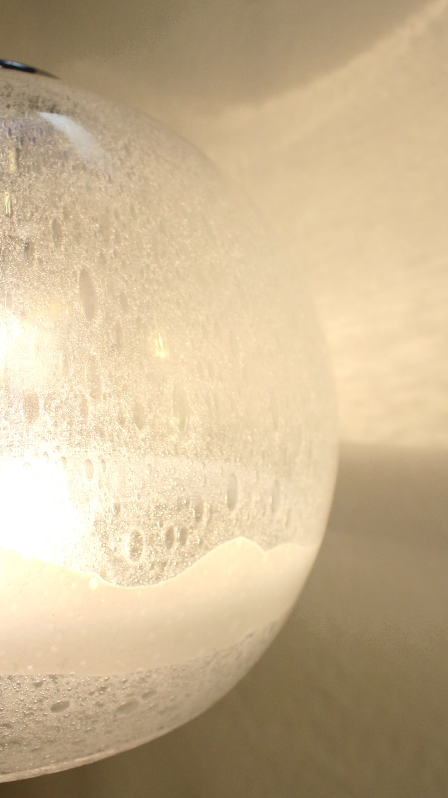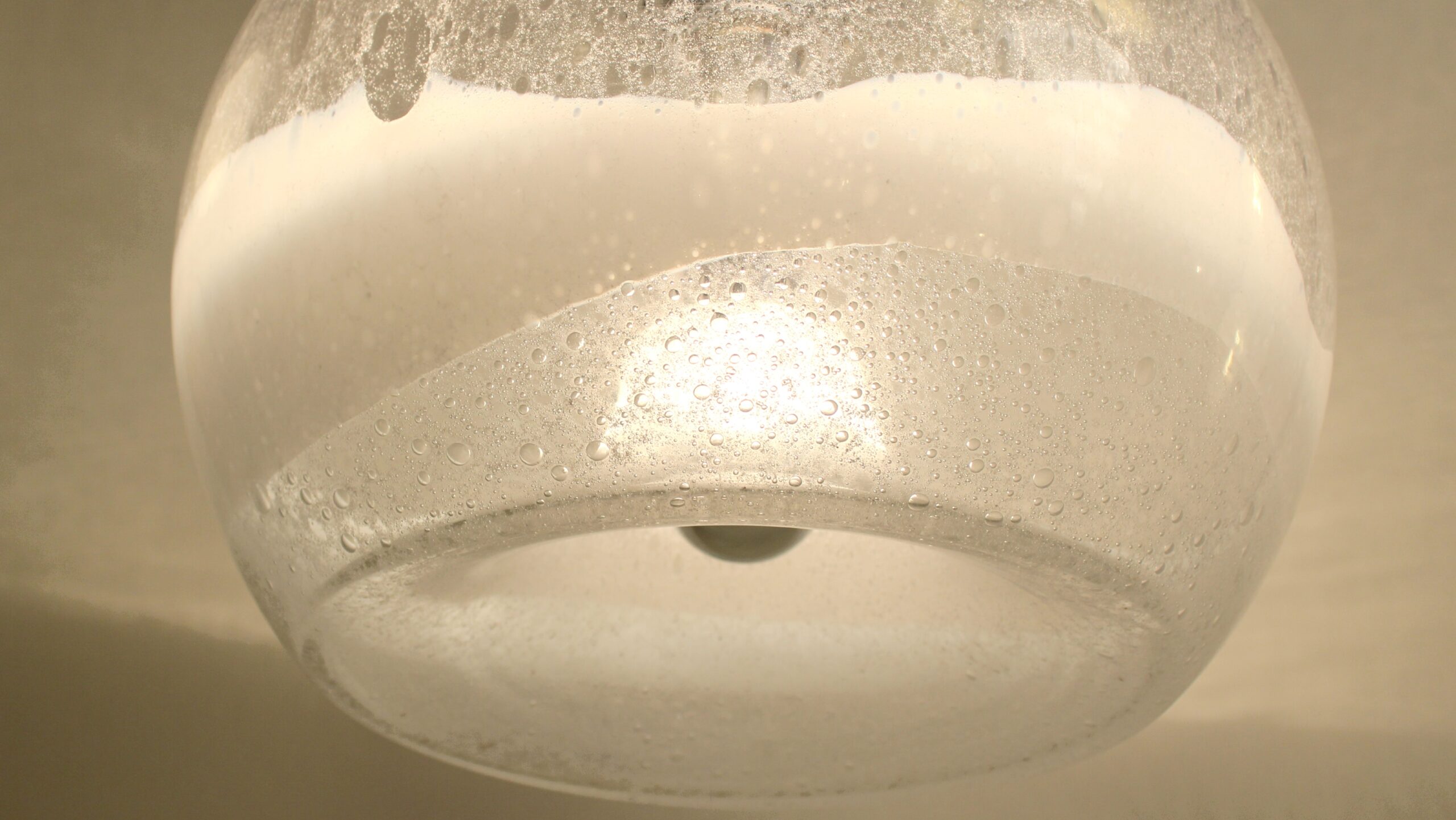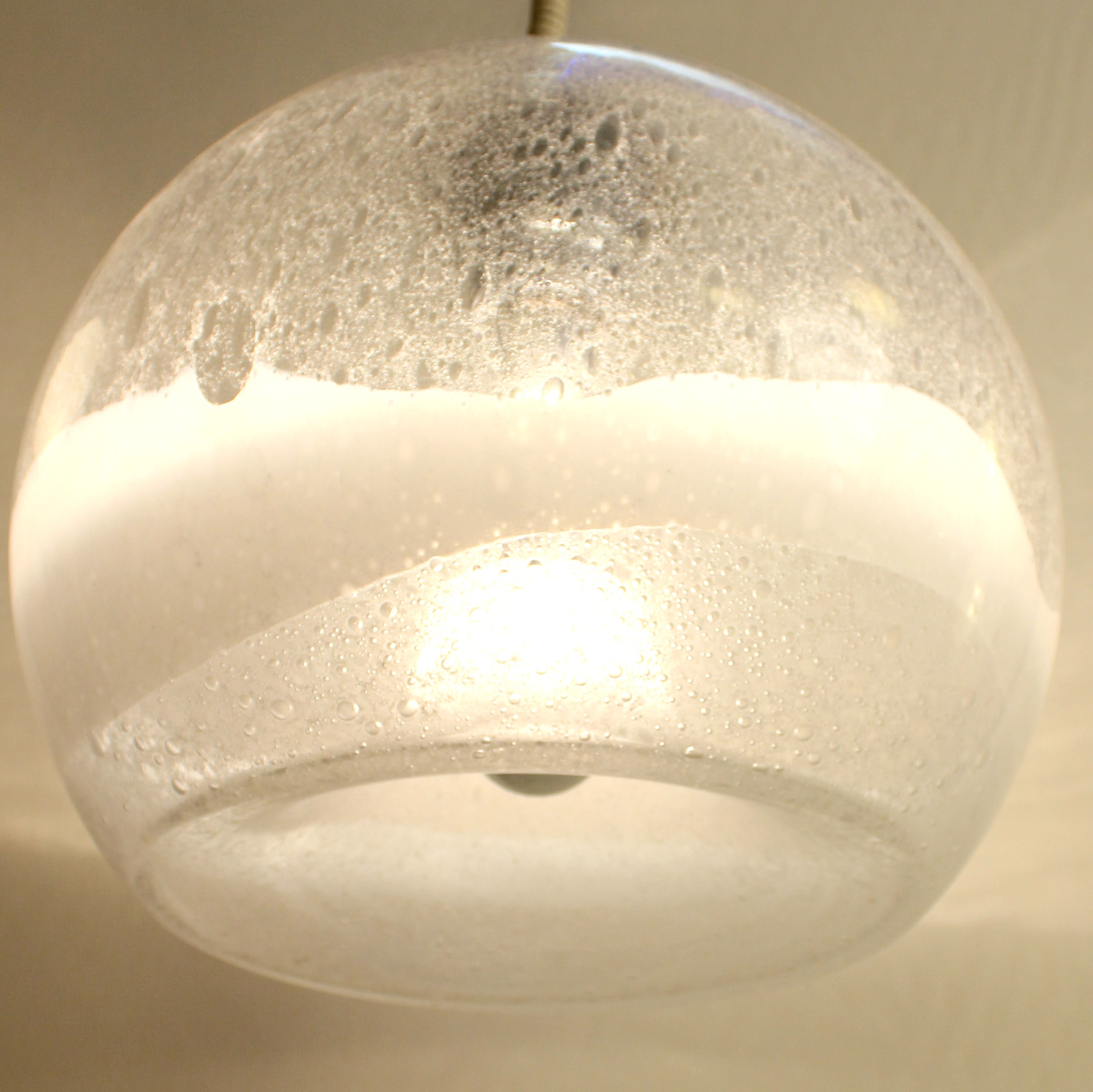 Est utilisé ici la technique appelé « Pulegoso », mélange de verre en fusion et de bicarbonate de soude. Ce dernier se décompose avec la chaleur créant des bulles d’air dans la matière.