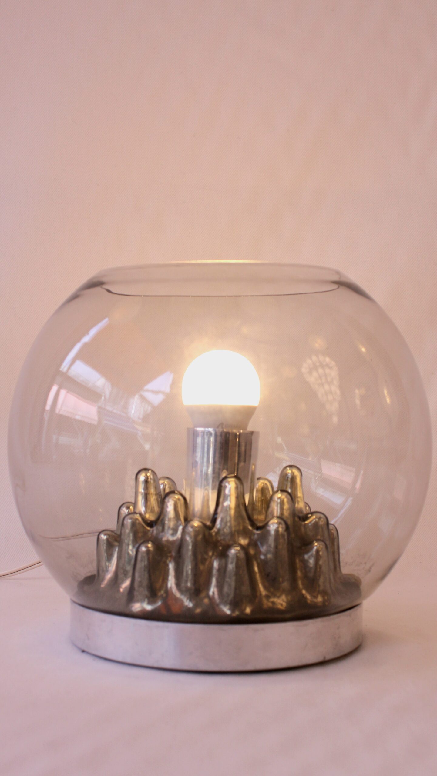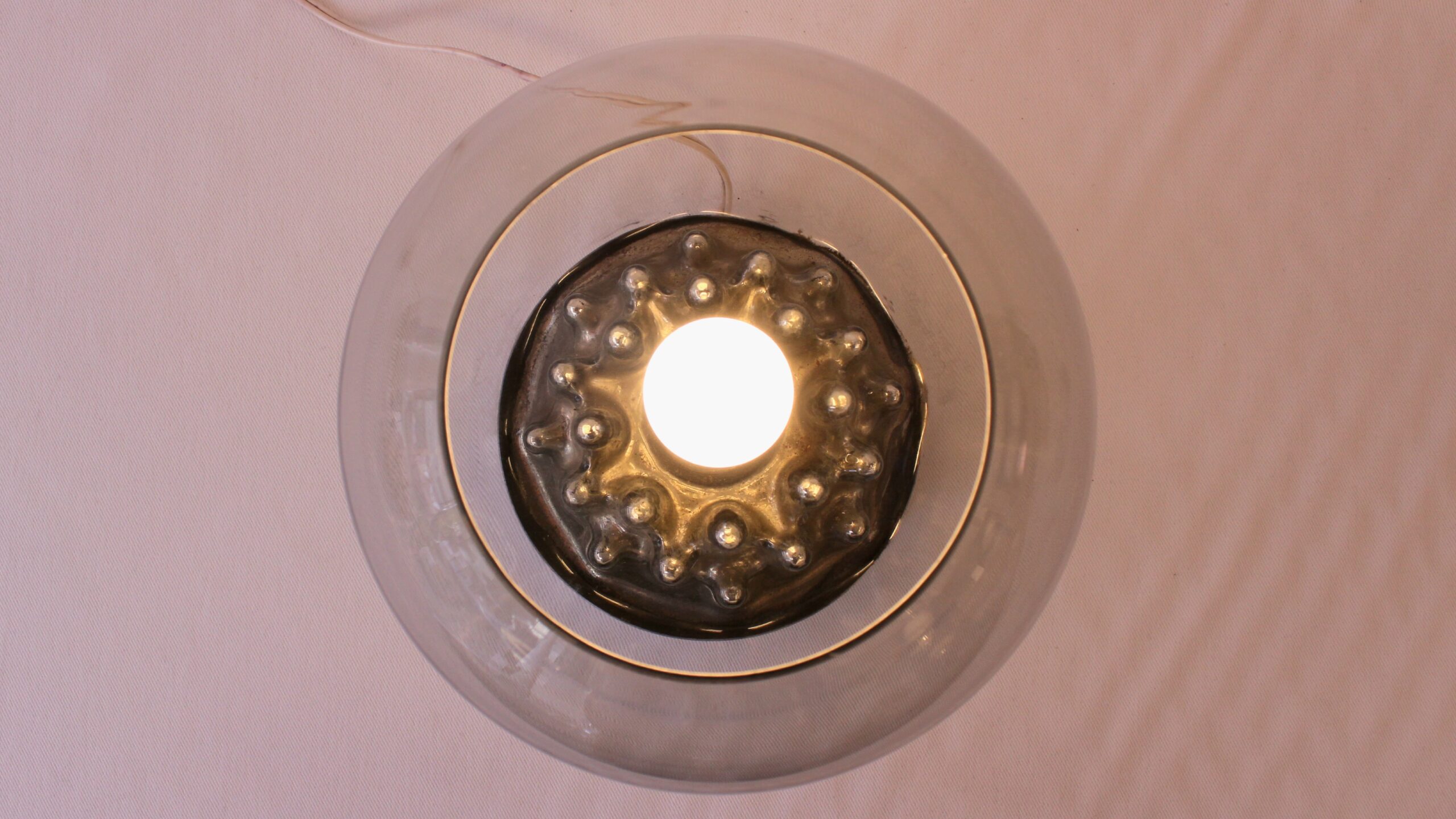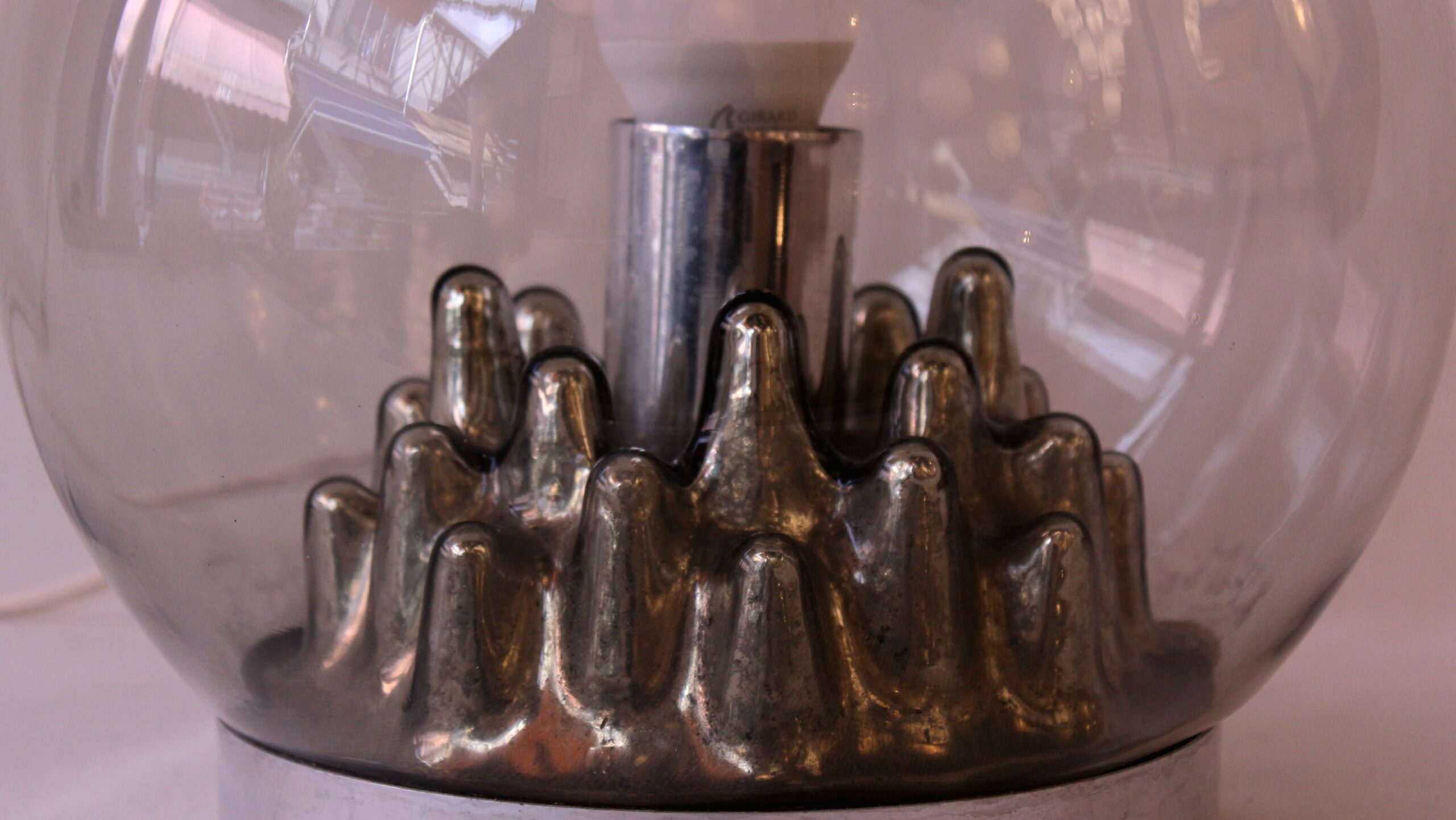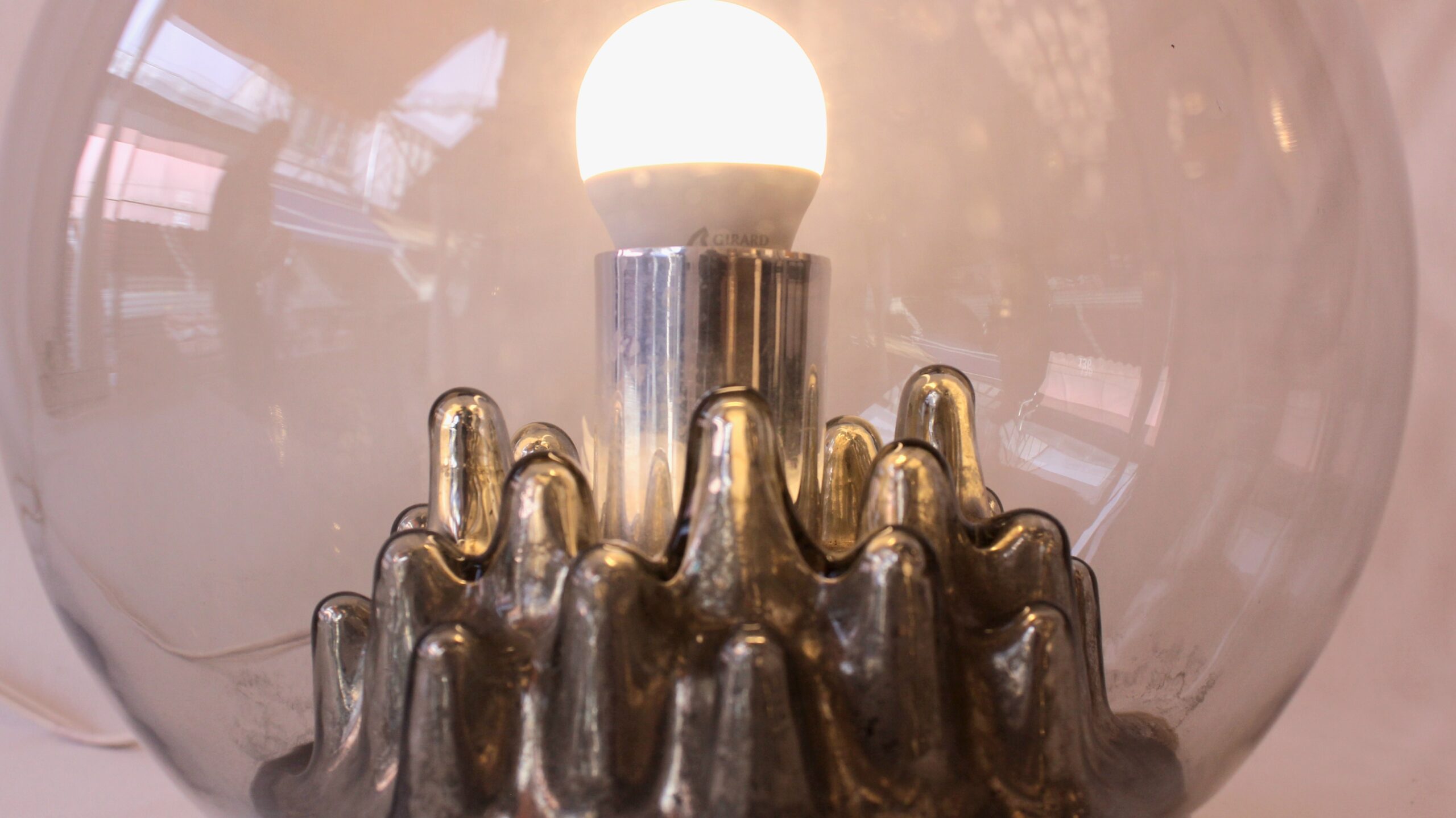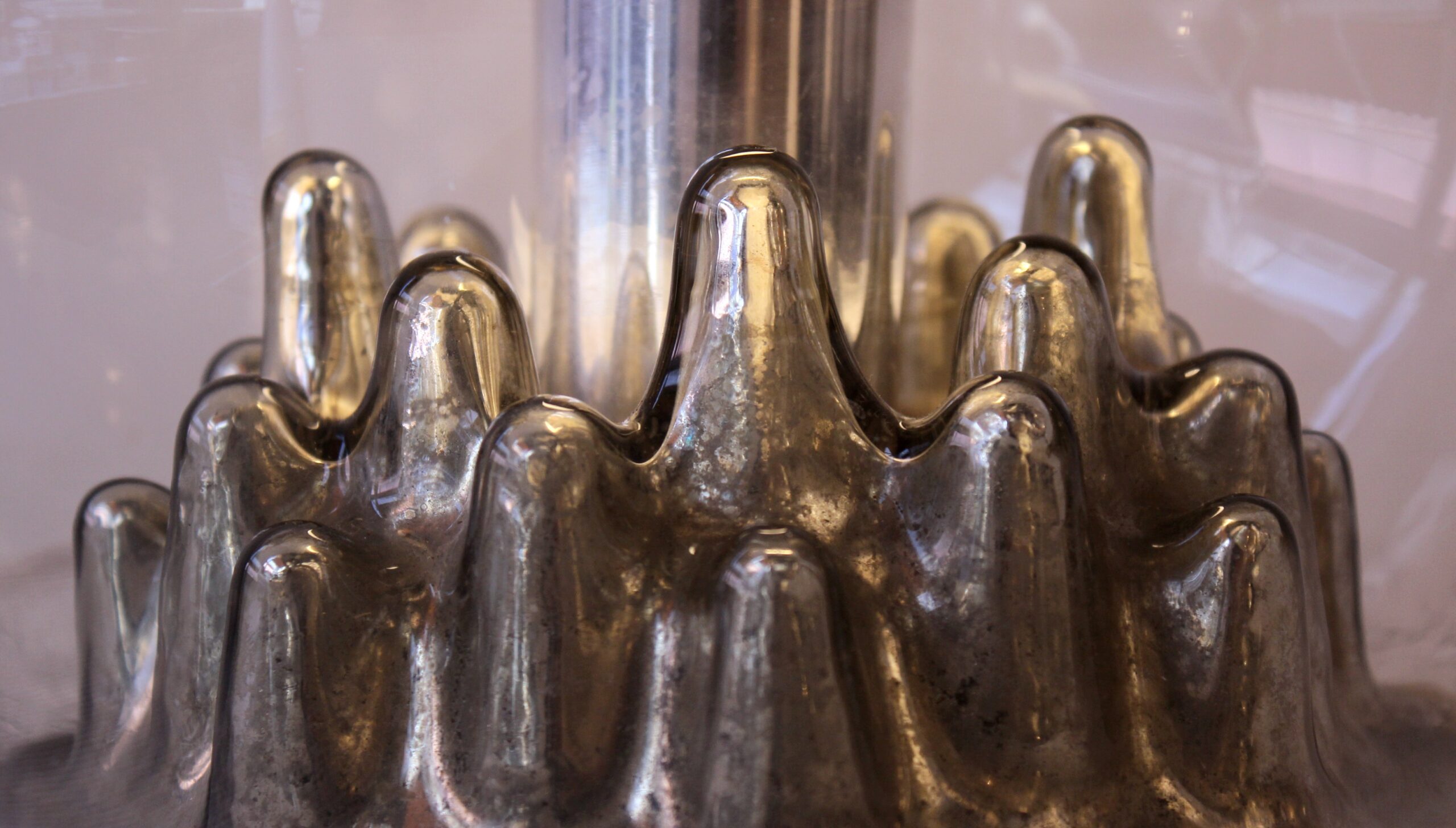 Verre de Murano soufflé, patine miroir à l’argent. Base en métal chromé.