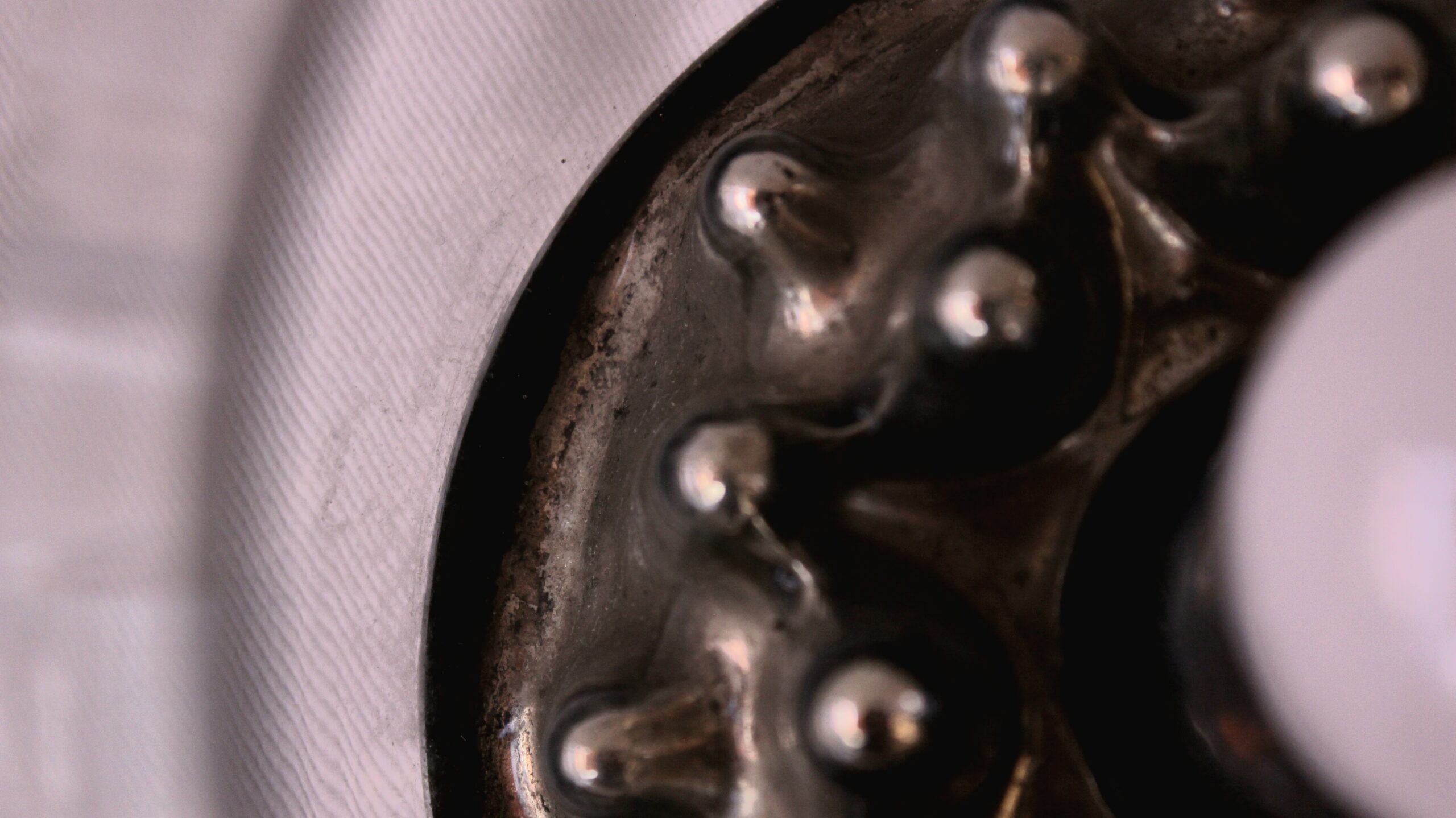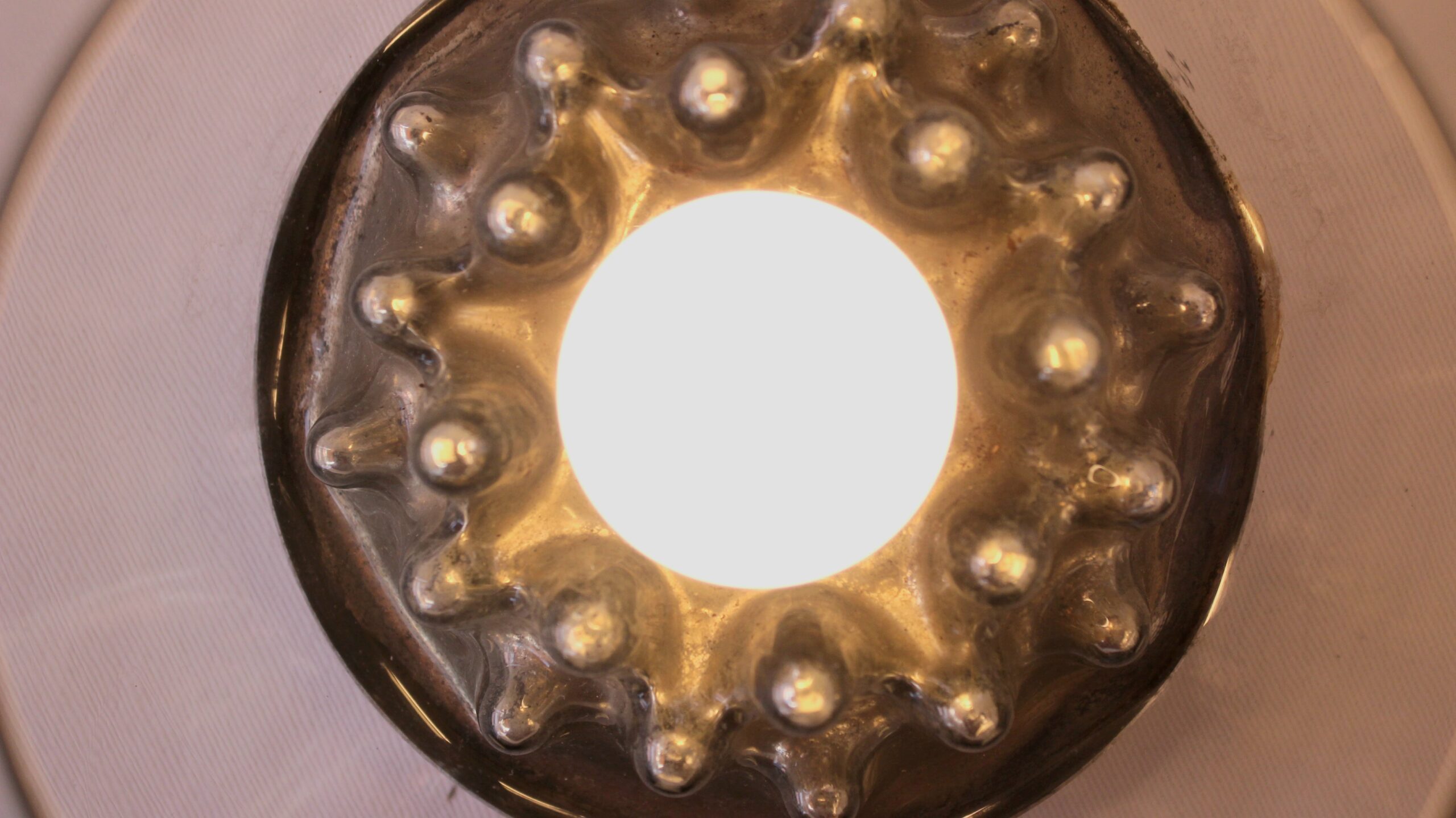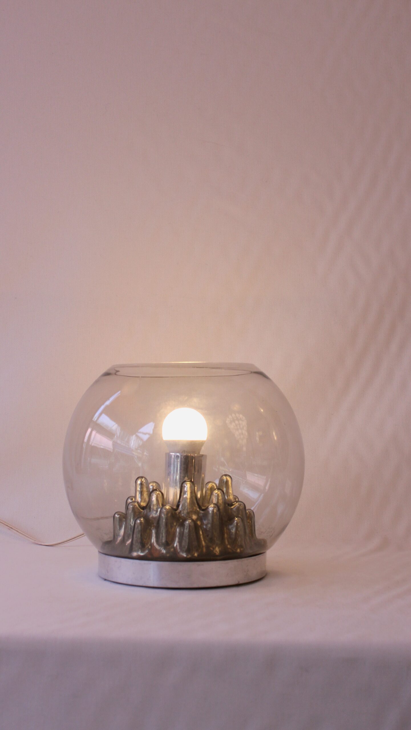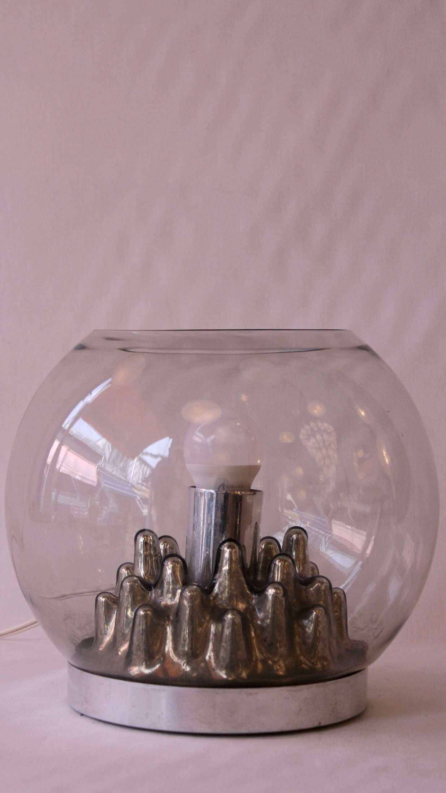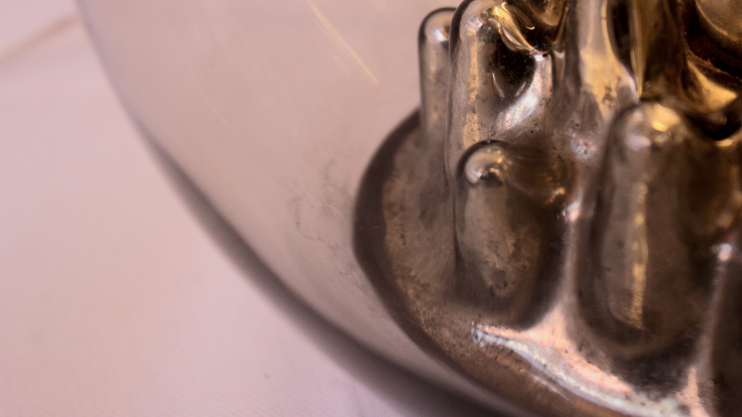 Verre de Murano soufflé, patine miroir à l’argent. Base en métal chromé.