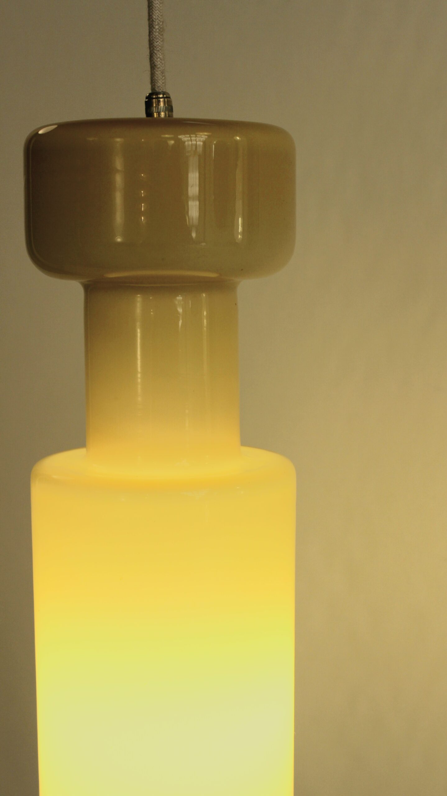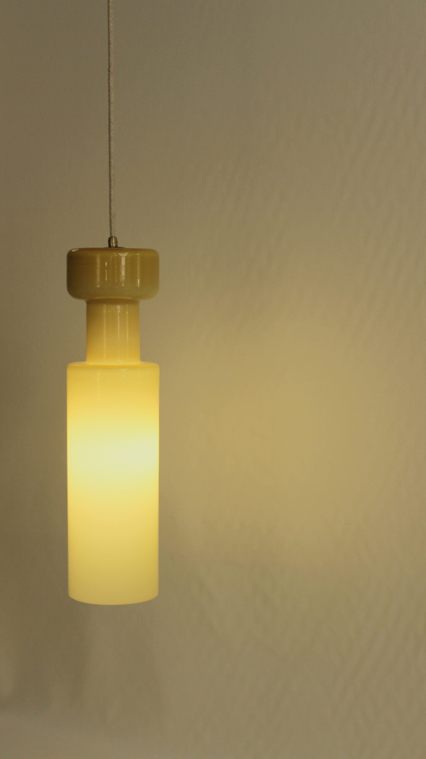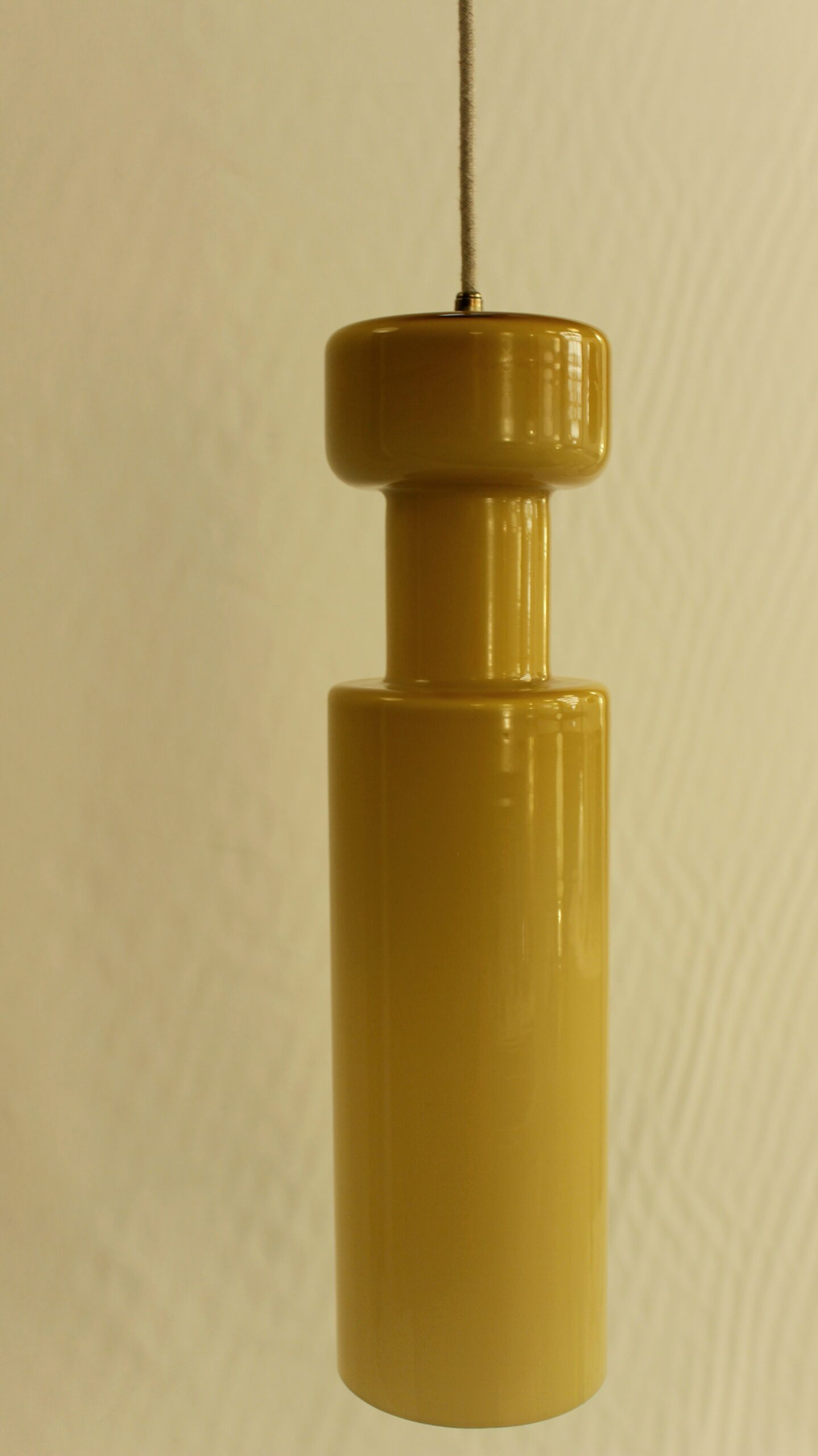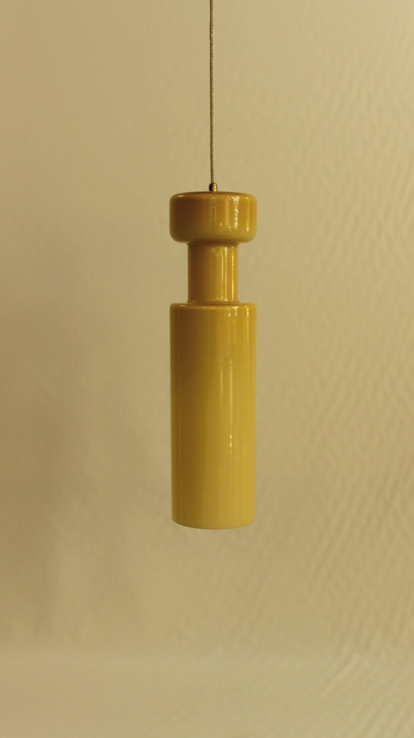 Suspension en forme de bouteille de couleur jaune. Edition de la marque italienne Stilnovo. Circa 1960.